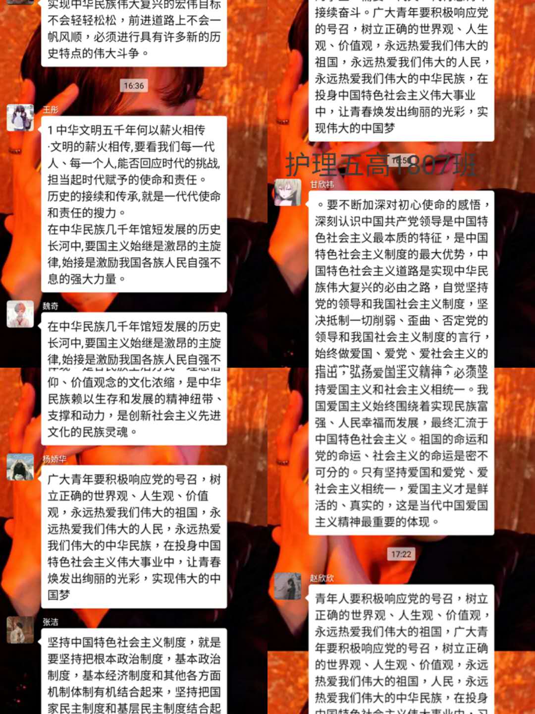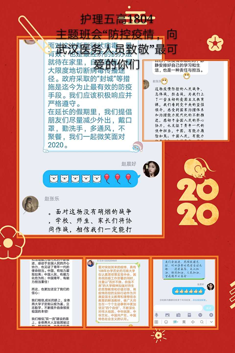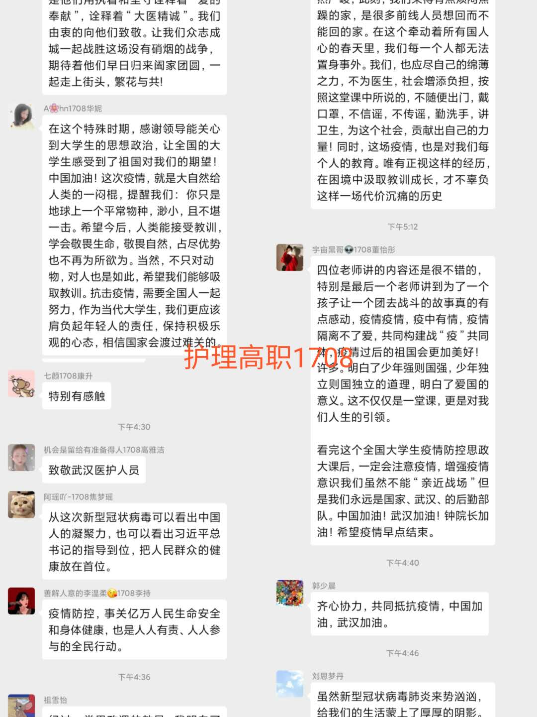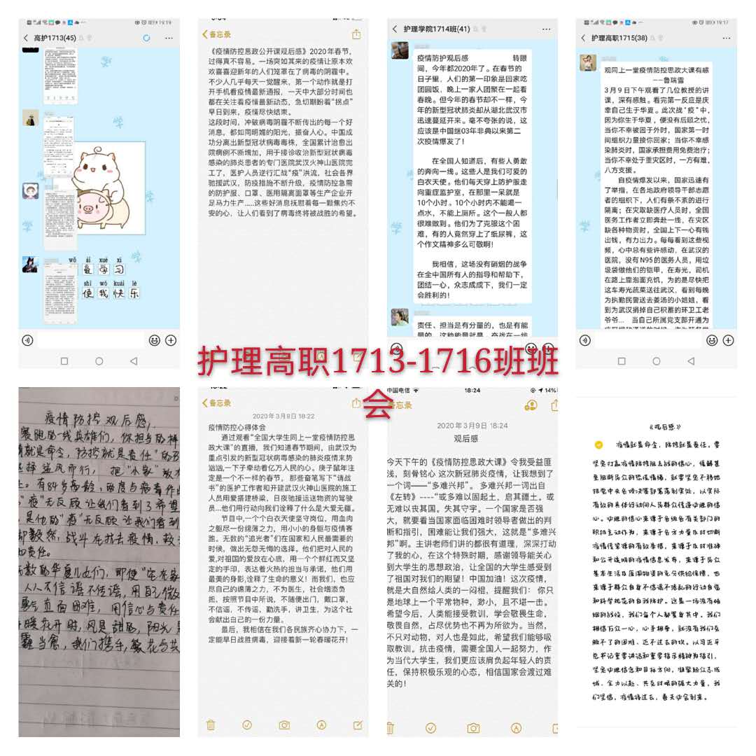 观看结束后,我院学生以班级为单位,在学管人员的指导下,开展了线上主题班会。师生们结合学科专业特点展开了讨论。jinnianhui金年会诚信至上党总支书记吴运胜认为:“对于jinnianhui金年会诚信至上的师生来说,这次思想政治教育课安排得很及时。在这场战‘疫’中,党和政府从历史中总结经验,担起人类命运共同体的责任,用‘武汉封城’的强大魄力,向世界彰显了中国共产党领导和中国特色社会主义制度的显著优势。作为党的教育工作者,我们要积极教育引导广大学生,坚定在以习近平同志为核心的党中央坚强领导下打赢这场疫情防控人民战、总体战、阻击战的信心和决心。”党总支副书记马淑红认为:“课堂中的战疫小故事,让我们看到了当代青年的大勇、大我和大德,我们要积极宣传学生身边的榜样事迹,继续引导广大青年学生勇担使命,积极奉献社会,为实现中华民族的伟大复兴梦而奋斗。”学生科科长李博认为:“这堂公开课兼具思想高度和理论深度,有数据有实例,有情感有温度,进一步增强了大学生的‘四个自信’,激发大学生的爱国热情和创新创业的动力。”护理高职1804班学生王晔在班会中说:“作为一名00后护生,我们要牢记医学生誓言和南丁格尔誓言,向奔赴疫情前线的前辈学习,做到胸有大志、心有大我、肩有重任、行有大德,用实际行动谱写自己大写的青春。”(撰稿:jinnianhui金年会诚信至上 王蓉 审核:李晓乾)