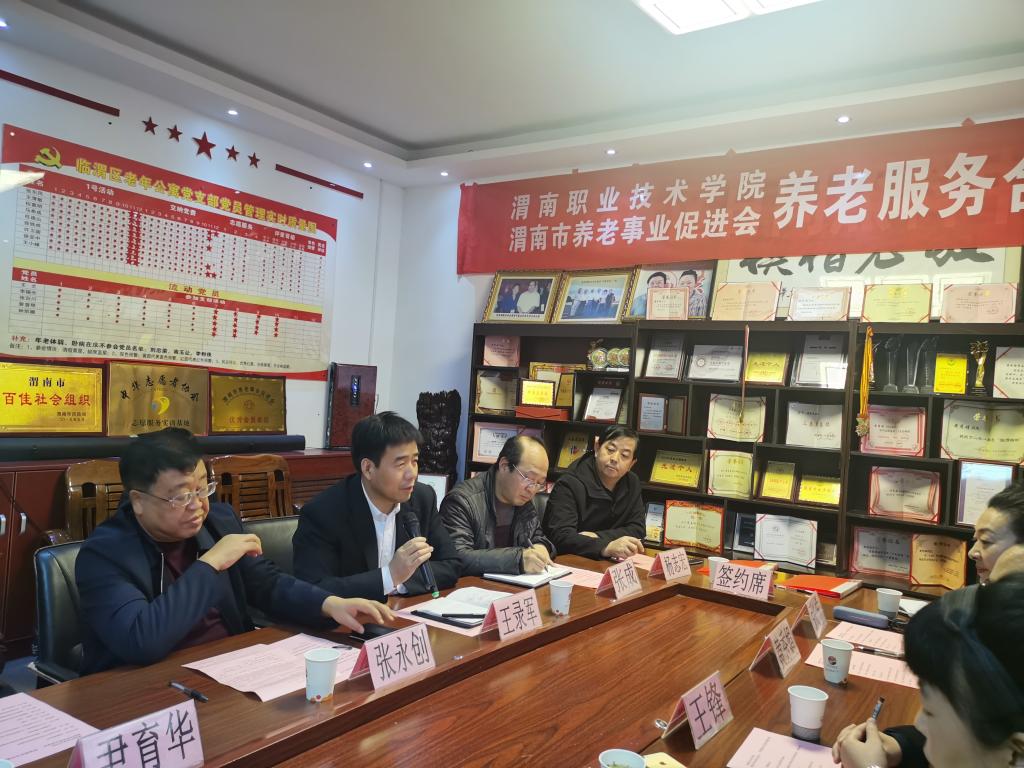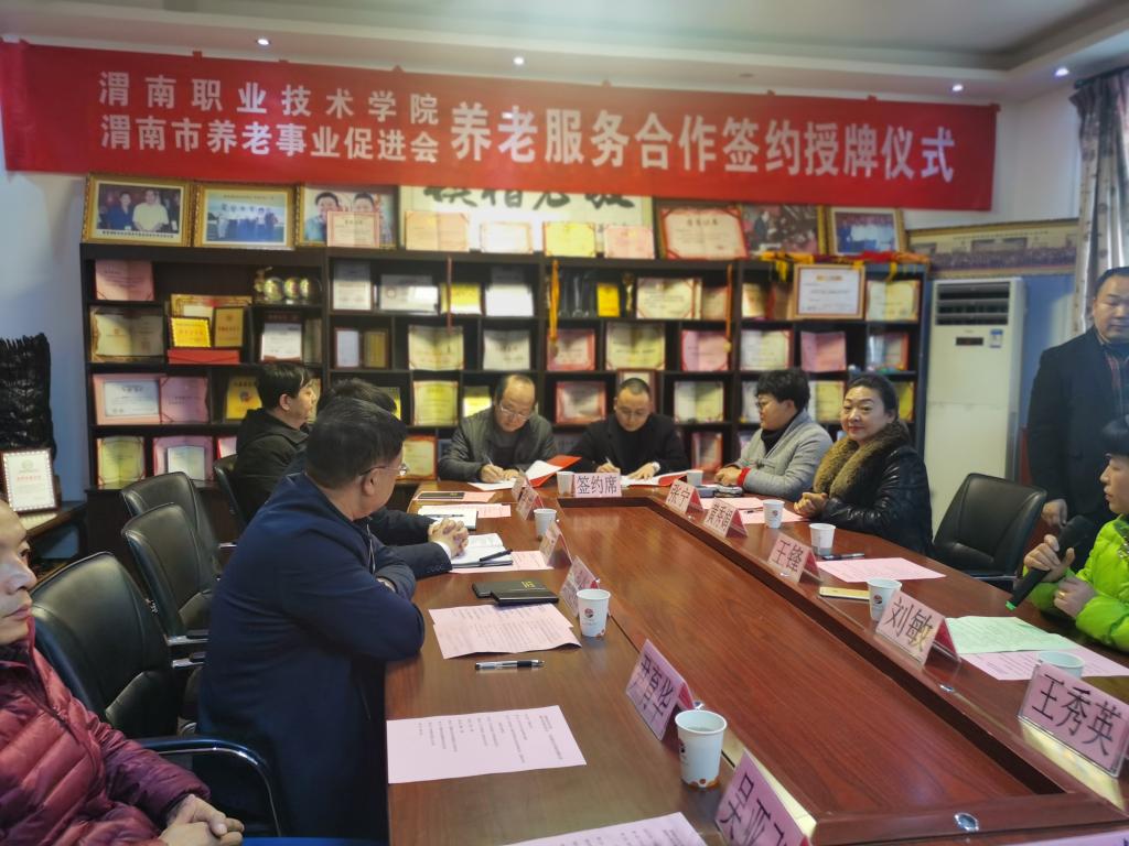 为推动渭南养老服务与管理事业发展,提升我院学生的养老服务能力与素养,12月13日下午,我校与渭南市养老事业促进会在临渭区老年公寓签订了合作协议,并举行了老年服务与管理专业首个校外实训基地挂牌仪式。渭南市民政局副局长张永创、社会福利科科长杨志宏,渭南市养老事业促进会会长王锋、临渭区老年公寓院长黄秀娟,我校副校长王录军、对外交流合作处处长尹育华、jinnianhui金年会诚信至上院长张成、副院长吴亚飞,老年服务与管理专业带头人任秋爱等出席会议。