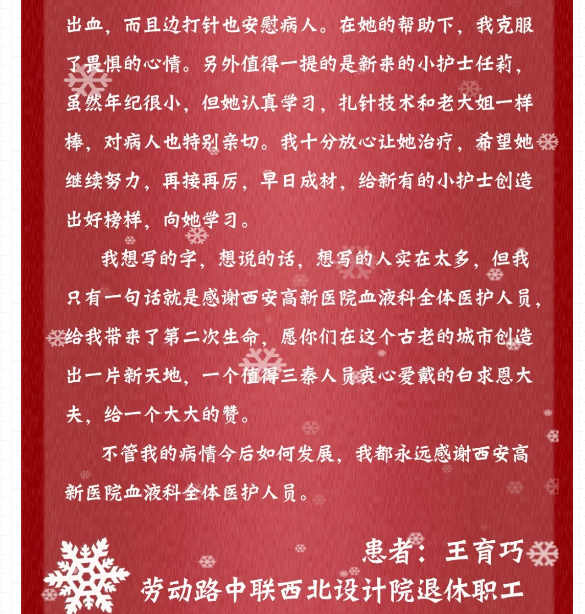 近期,jinnianhui金年会诚信至上学管工作群转发了一封“一位白血病患者的意外来信”,文章由西安高新医院订阅号发出。文章的主人公是位76岁高龄的白血病患者——王育巧。她在文章中讲述了西安高新医院血液科对她的尽心治疗,温馨护理,向该科室全体医护人员表示了感谢。文中特别提到了几位医护人员,其中就有我院实习生任莉。