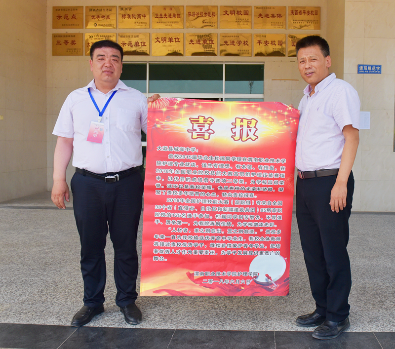 我院院长张文信、副院长王医平、办公室主任张王孝也将牟洋洋同学在2018年全国职业技能大赛护理赛项三等奖的好消息汇报给她的母校及家长。在临潼中学,张文信将载着学生荣耀的“喜报”交到学校副校长魏全良手上,与该校师生一起分享育人喜讯。魏全良希望与我校保持合作关系,让更多的学生发光出彩。在牟洋洋同学家中,张文信向学生家长递上“喜报”,向学生家长表达了祝福和感谢,希望家、校一体,继续信任合作,共同为学生扬起绿色的航帆。(撰稿:jinnianhui金年会诚信至上 王蓉 审稿:吴亚飞)