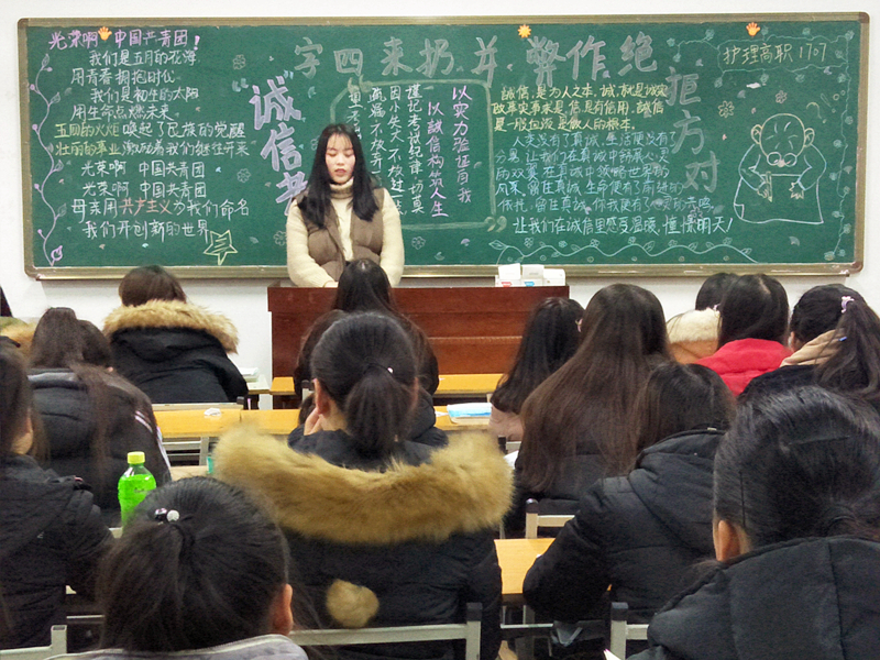 各班心理委员以板报、组织讨论、提问等方式引导同学学习诚信意识,用身边的真实案例帮助同学正确认识诚信的重要性,教育同学们应端正态度,诚实面对考试。同学们表示会增强诚信意识,从自身做起,认清作弊危害,诚信做人,诚信考试。团总支对各班开展的情况进行了评比,护理高职1707班针对等问题组织讨论,互动交流,课堂气氛活跃,获得学生干部的一致好评。