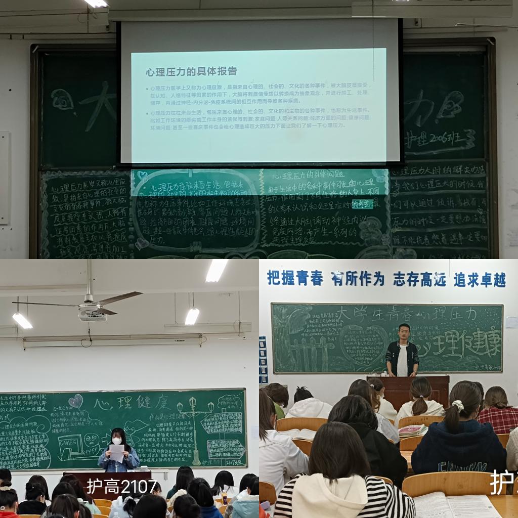 课上,各班心理委员以板报、组织讨论、提问等方式带领学生学习了青春期心理压力知识,用校园真实案例帮助学生正确认识压力,提醒学生正确应对压力,及时缓解压力。接着,他讲述了大学生缓解压力的方法,如参加学校组织的各项活动,保持乐观开朗、积极进取的良好心态。学生们纷纷表示他们会正视自身心理问题,以积极健康的状态面对生活的每一天。团总支组织了检查评比,其中护理高职2107班以压力测试题导入课堂,课堂气氛活跃,感染力强,表现突出,荣获各位学生干部的一致好评。
