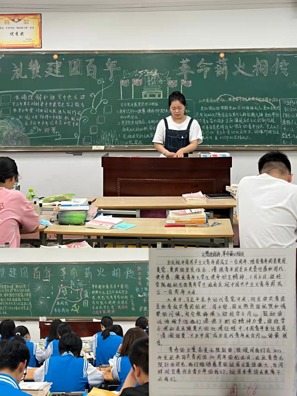 本次团课由团支书主讲。课前,团支书精心设计方案,认真组织实施,动员广大团员青年积极参与,全体团员庄严举起右手,重温入团誓词。课上,团支书以办板报、观看视频、分享心得等形式带领同学们回顾了百年团史,深入学习共青团的光荣历史、发展沿革和革命先辈们的奋斗故事,形成了团支书带头组织、团员青年自发参与、广大学子积极响应的浓厚氛围,并引导同学们要争做优秀团员,担当青年使命。
