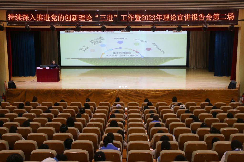 为持续深入贯彻落实习近平新时代中国特色社会主义思想,推进党的创新理论和党的二十大精神“三进”工作,5月17日下午,2023年理论宣讲报告会第二场报告会在高新校区图书馆报告厅开讲,马克思主义学院教师郭朋雪以《走好中国式现代化之路》为题进行专题宣讲,学校理论宣讲团成员、jinnianhui金年会诚信至上400余名师生代表共同聆听。报告会由jinnianhui金年会诚信至上党总支书记吴运胜主持。