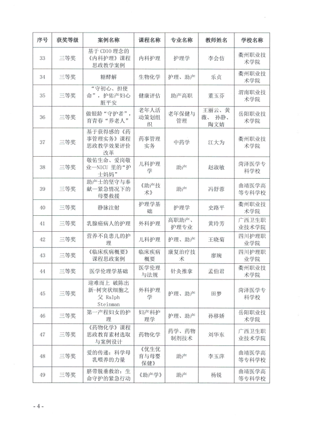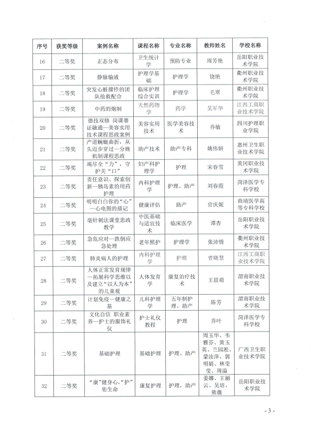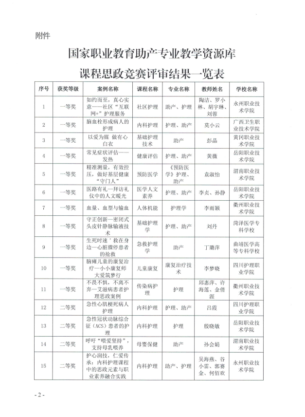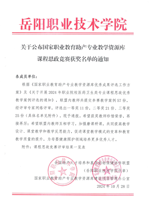 根据《国家职业教育助产专业教学资源库优秀成果评选工作方案》及《关于开展2024年职业院校医药卫生类专业课程思政优秀教学案例评选通知》,为提高我院教师教学设计、课堂教学和教学反思能力,进一步促进专业课教师课程思政能力提升,我院推荐5部优秀课程思政案例作品参加本次评选。经评审专家网络评审,评选出一等奖11份,二等奖24份、三等奖25份。我院共有5门课程获奖。袁淑怡、孙会娟、王晨萌、陈芳、董玉芬5位老师分别取得一等奖1项、二等奖3项、三等奖1项的好成绩。