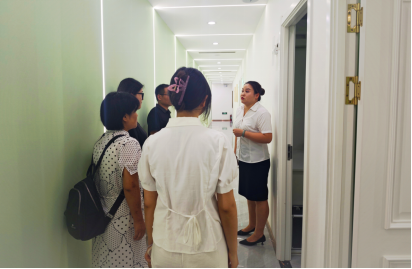 在雷庭的带领下,师生一行先后参观了标准化美容室、智能仪器操作间、员工活动中心等区域。明亮整洁的工作环境、先进的皮肤检测设备、科学的分区管理模式,让学生们直观感受到现代化美业机构的专业运营体系。