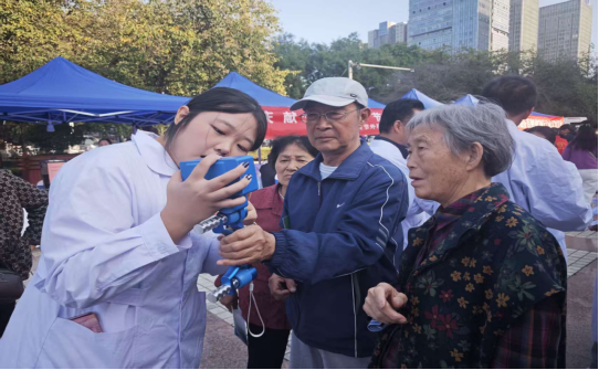 9月24日,双方联合在市中心广场开展 “国庆献爱心,医心护健康”大型义诊活动,将“岗位实践”融入民生服务。渭南市中心医院老年病科专家团队化身“企业导师”,围绕老年人常见慢性病管理、健康监测等智慧健康养老核心岗位需求,现场示范血压血糖检测、健康咨询沟通、科普知识宣讲等职业技能;jinnianhui金年会诚信至上智慧健康养老服务与管理专业学生以“准从业者”身份参与服务,在医护人员指导下完成市民血压测量、血糖检测、老年健康手册发放等工作,累计服务150余人次,发放资料200余份。