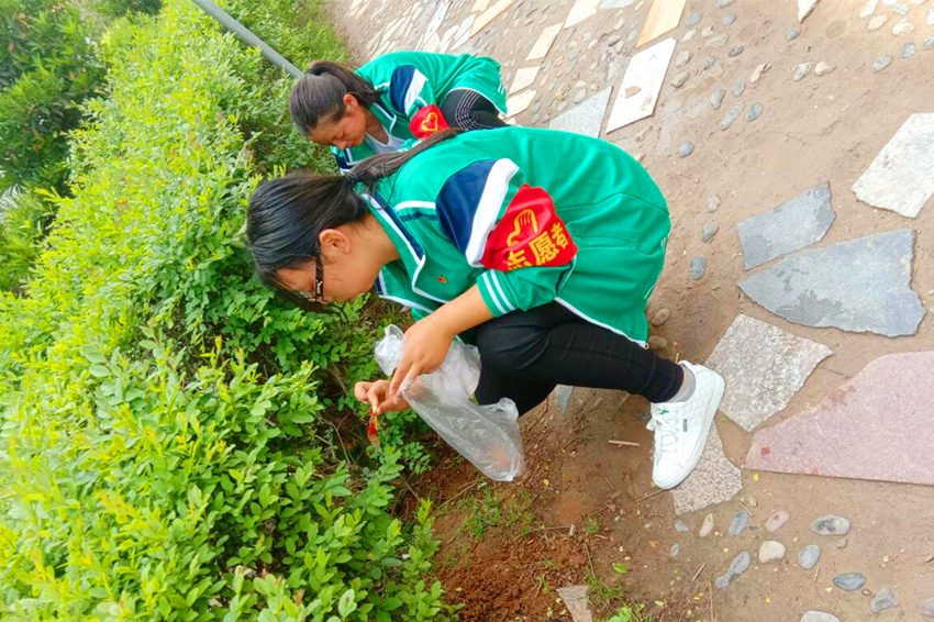 夏始春余,叶嫩花初,校园欣欣向荣,栀子园月季荼蘼,木槿园、紫荆园林木郁郁,榴花如火。志愿者们把院内外及小吃街前后的白色垃圾及杂草全部清理干净,对校园环境进行了规整美化。经过志愿者一个小时的精心劳作,我校环境更加卫生整洁。