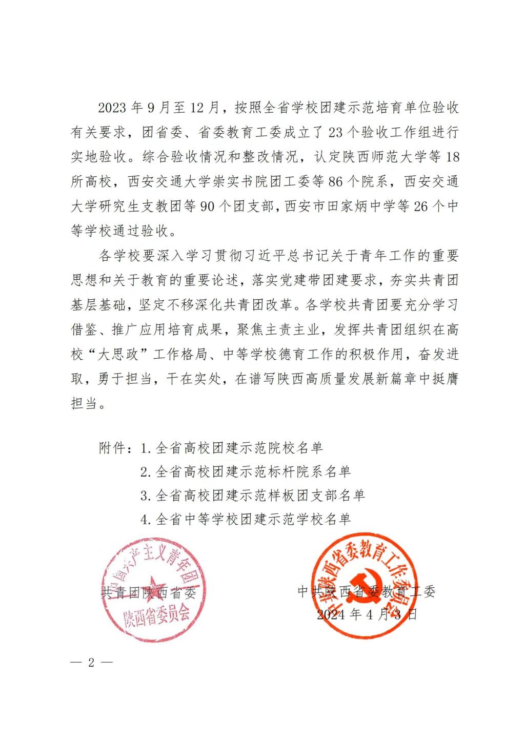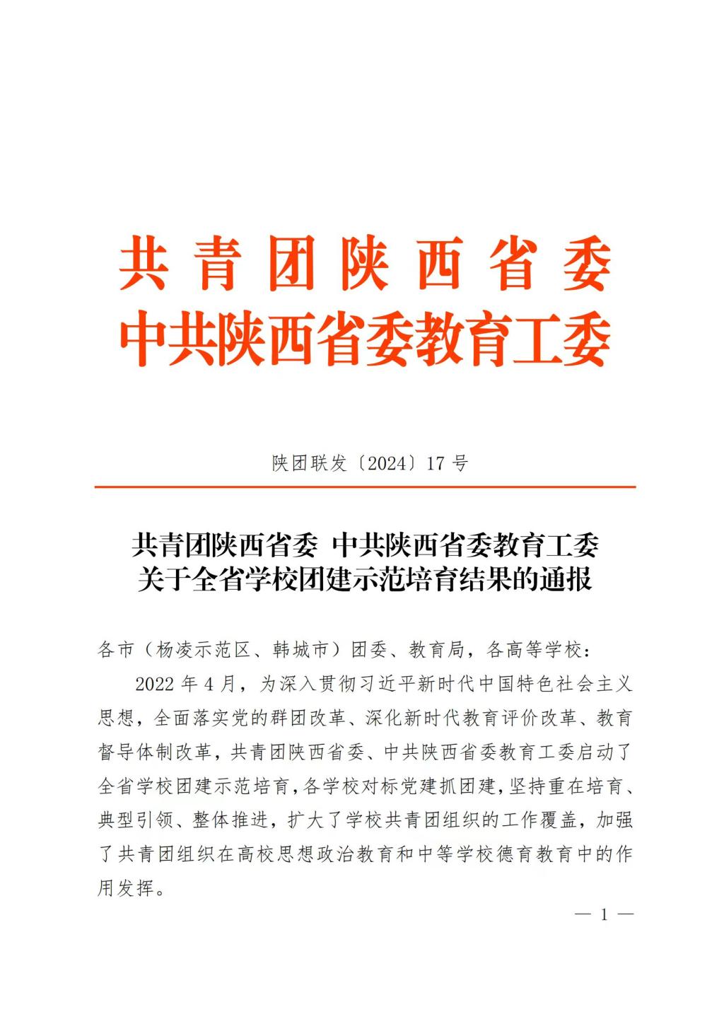 近日,共青团陕西省委、中共陕西省委教育工委联合印发了《关于全省学校团建示范单位培育结果的通报》,jinnianhui金年会诚信至上团总支被确定为“全省高校团建标杆院系”,并授予荣誉奖牌。